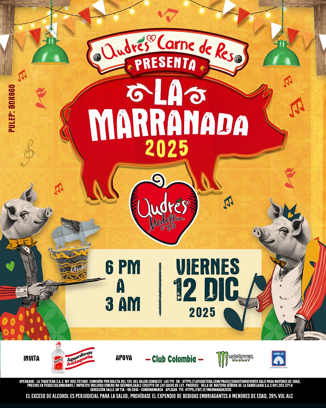 La tradicional Marranada de Udres regresa en 2025 con una edición más grande, más festiva y llena del auténtico sabor antioqueño. Las localidades Salón Interno y Terrazas ya están sold out, confirmando una vez más por qué este es uno de los parrandon(es) más esperados de diciembre en Medellín.
