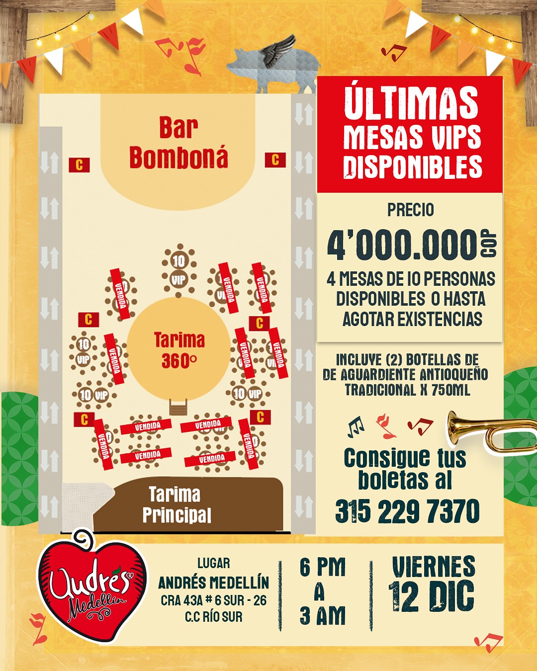 Aún estás a tiempo de vivir este jolgorio: quedan disponibles las últimas 5 Mesas VIP, una opción exclusiva con ubicación preferencial, 2 botellas de Aguardiente Antioqueño cortesía del patrocinador, y un kit fiestero especial para disfrutar la noche como se debe.